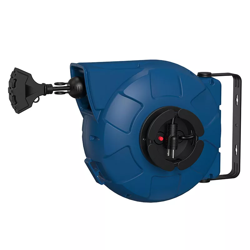 Acél tartó falra szereléshez, masszív műanyag ház és praktikus hordozó fogantyú: az elektromos kábeltekercs ideális kábelhosszabbító.